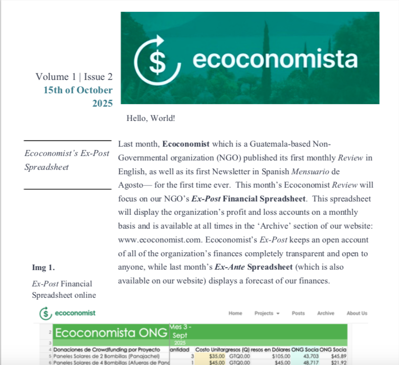 Ecoconomist is a non-governmental organization based in Guatemala that works to strengthen economic and environmental resilience in vulnerable rural communities. The organization finances and implements sustainable, locally adapted solutions — including solar energy systems, household water filters, and aquaponic fish tanks — that address fundamental challenges related to energy access, clean water, and food security. These technologies are introduced as practical tools to reduce recurring costs, improve household stability, and support dignified, long-term livelihoods.